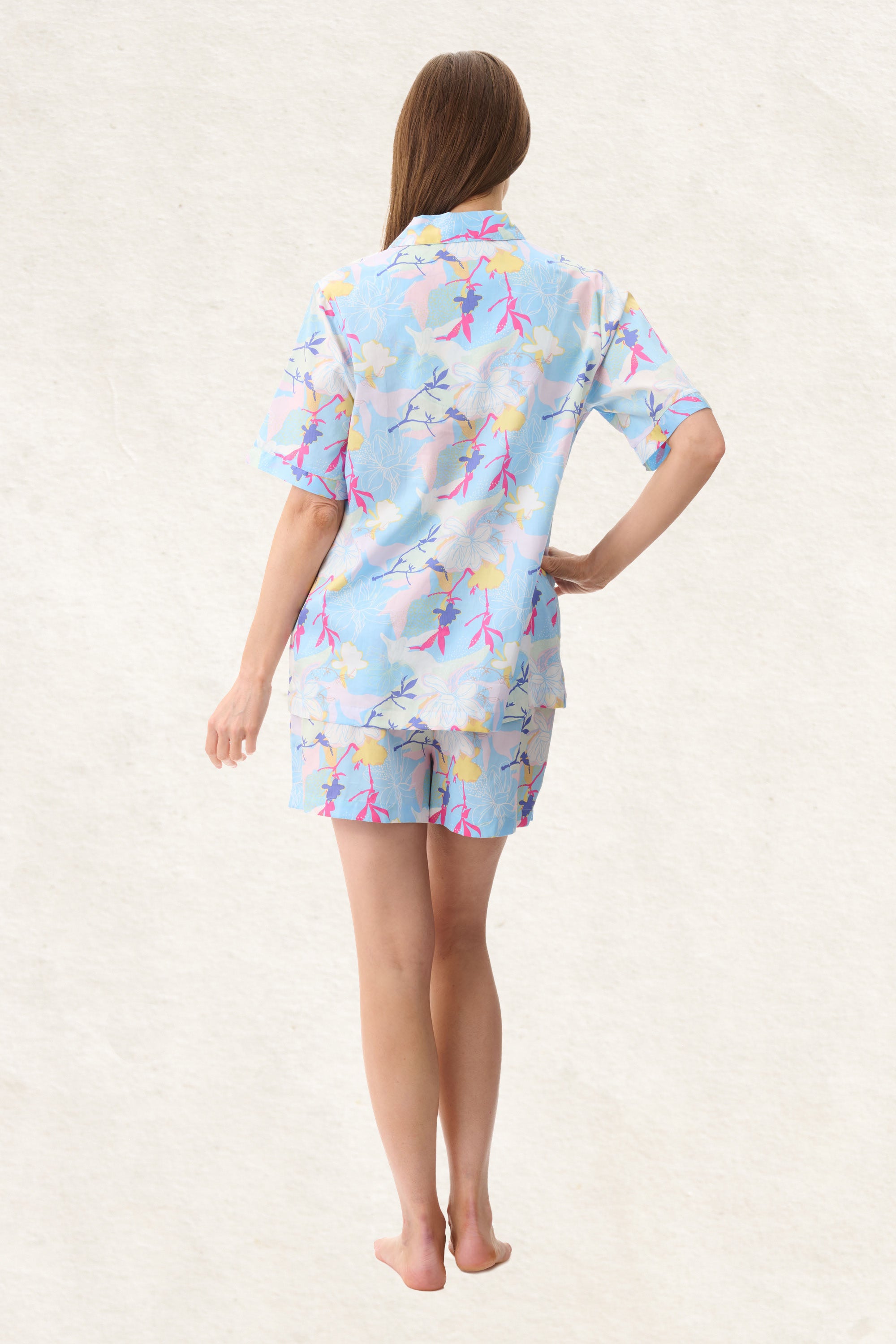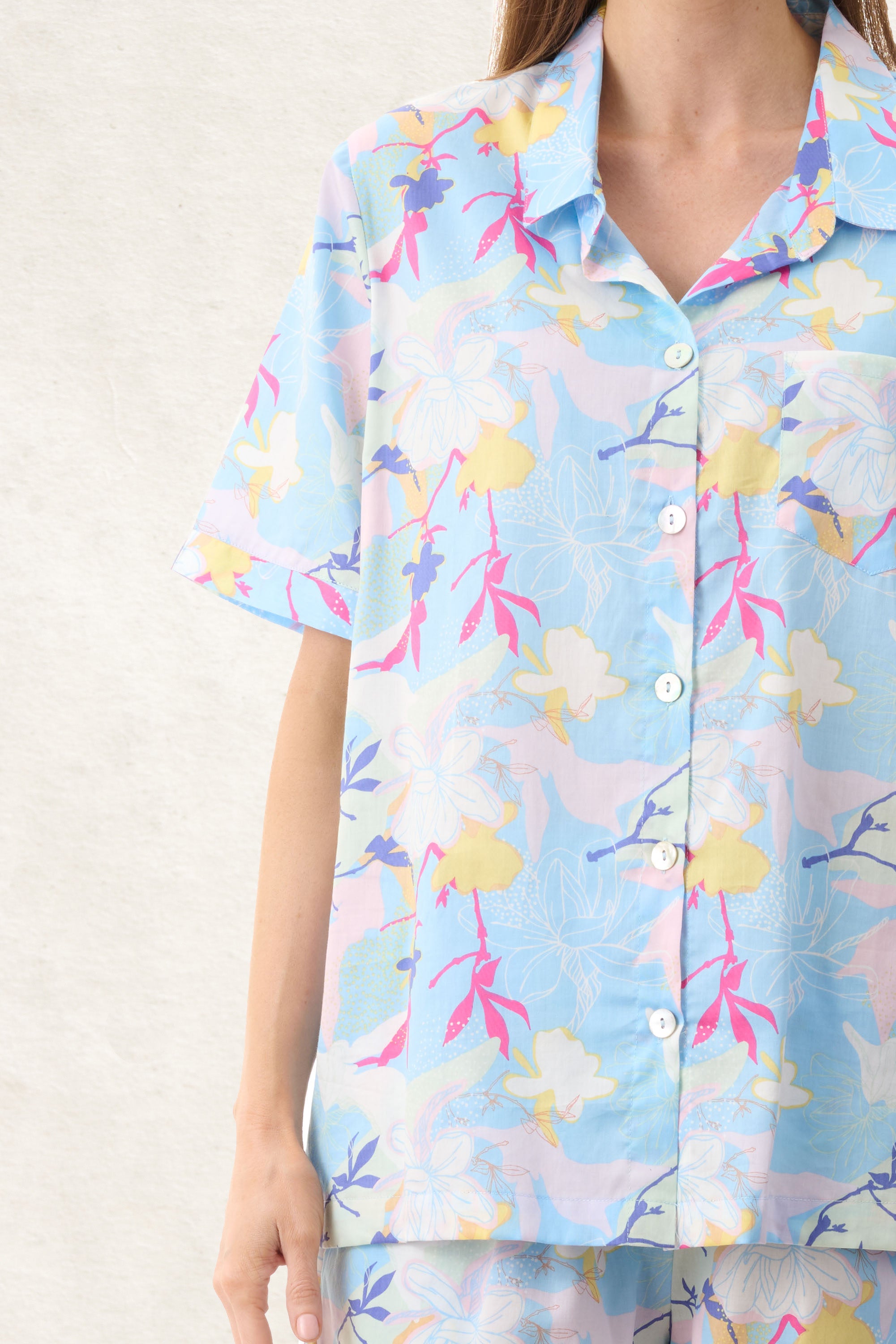 Discover our Xander vibrant print with a breezy blue base with splashes of summery playful print details. Crafted from 100% breathable cotton, this short pyjama set features short sleeves with cuff, button down shirt and patch pocket. The soft breathable fabric brings a modern pop of colour and effortless energy—perfect for warm-weather lounging and dreamy summer nights.