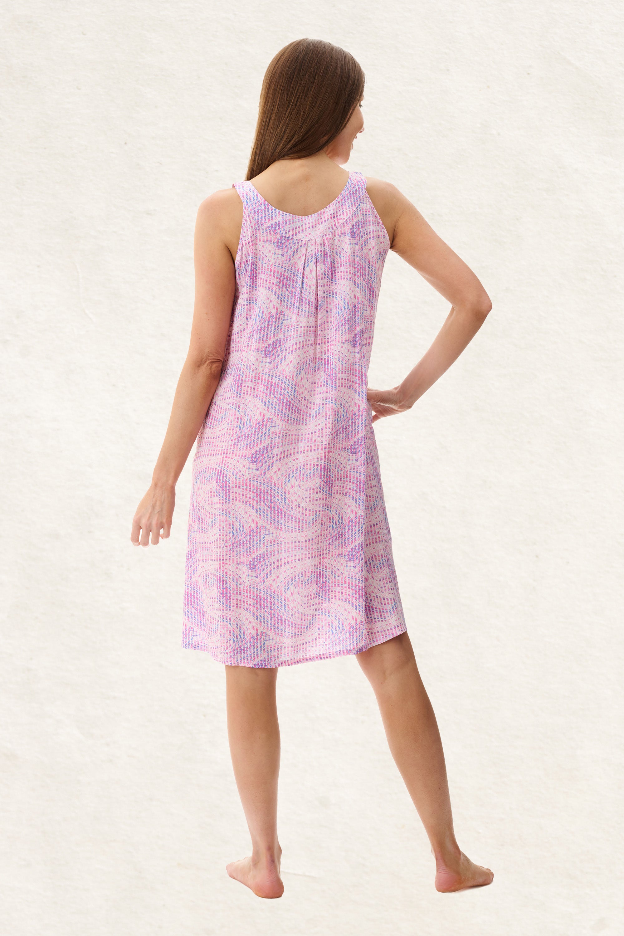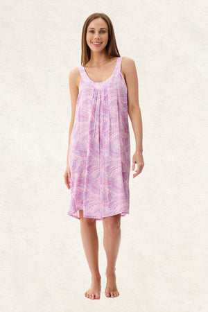 Introducing our Reese sleeveless short nightie - the epitome of style and comfort for warm summer nights.  This sleeveless nightie is crafted from 100% woven viscose and it features a shaped neck band feature with centre pleats.     Light soft and cool, this swirly abstract print pyjama set is perfect to wear on warm summer nights.