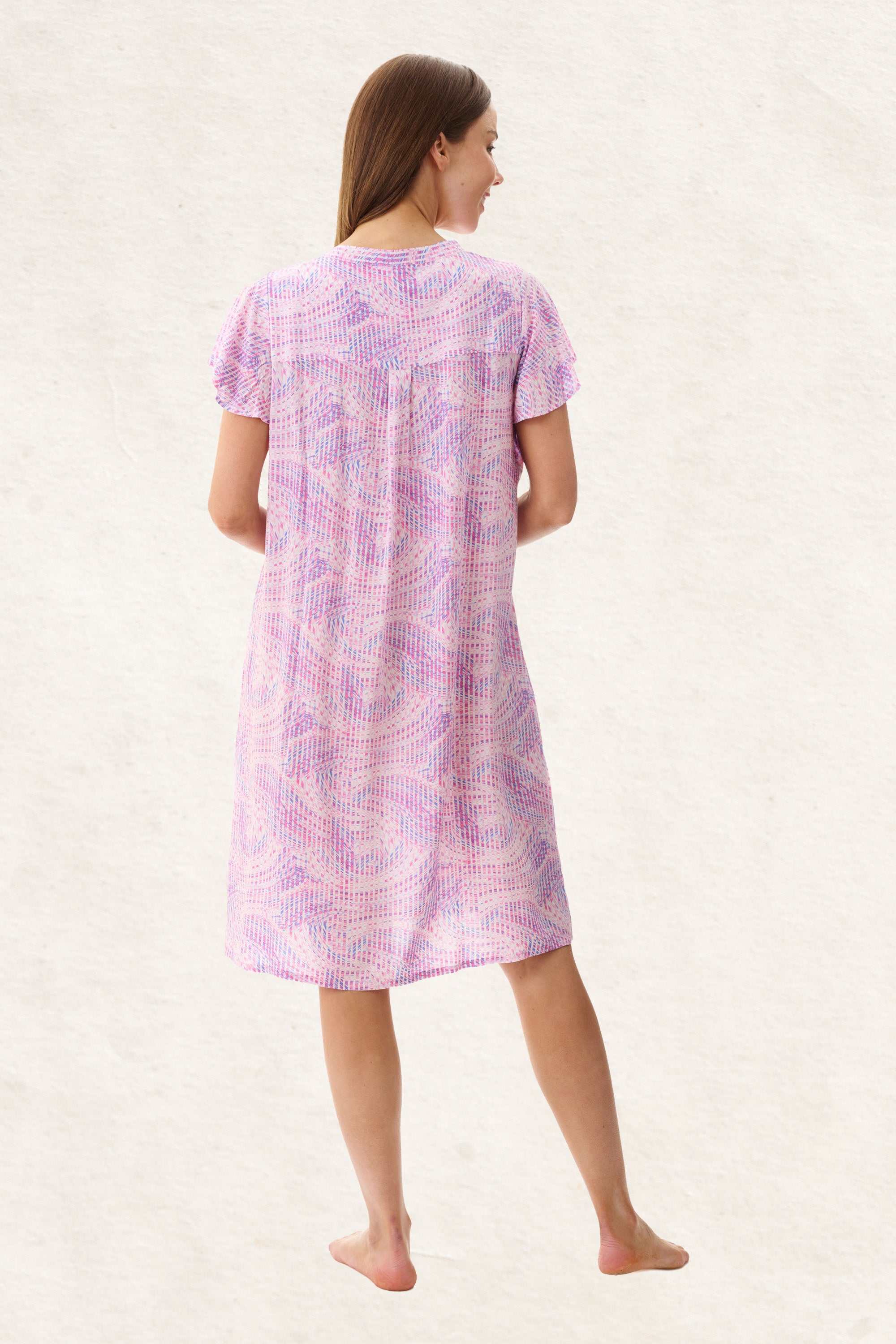 Introducing our Reese flutter sleeve short nightie - the epitome of style and comfort for warm summer nights. This flutter sleeve nightie is crafted from 100% woven viscose. It features flutter sleeves, soft gathers on the body and an open v neckband. Light soft and cool, this swirly abstract print pyjama set is perfect to wear on warm summer nights.