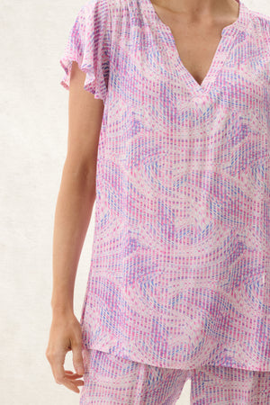 Introducing our Reese capri pyjama set - the epitome of style and comfort for warm summer nights. This flutter sleeve capri pyjama set is crafted from 100% woven viscose. The top features a flutter sleeve, soft gathers on the body and an open V neckband. The pants have a soft elasticated waist with self fabric waist tie and pockets. Light soft and cool, this swirly abstract print pyjama set is perfect to wear on warm summer nights.