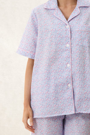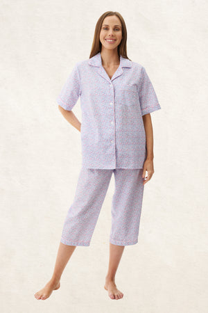 Grace capri pyjama in a petite multi floral print is an easy care garment made in polyester cotton woven seersucker. A classic short sleeve pyjama top with collar, front chest pocket, sleeve cuffs and full front button opening. The pyjama is trimmed with a complimentary rose coloured satin piping. The capri length pants have a soft elastic waist with satin drawstring and leg cuff piping.