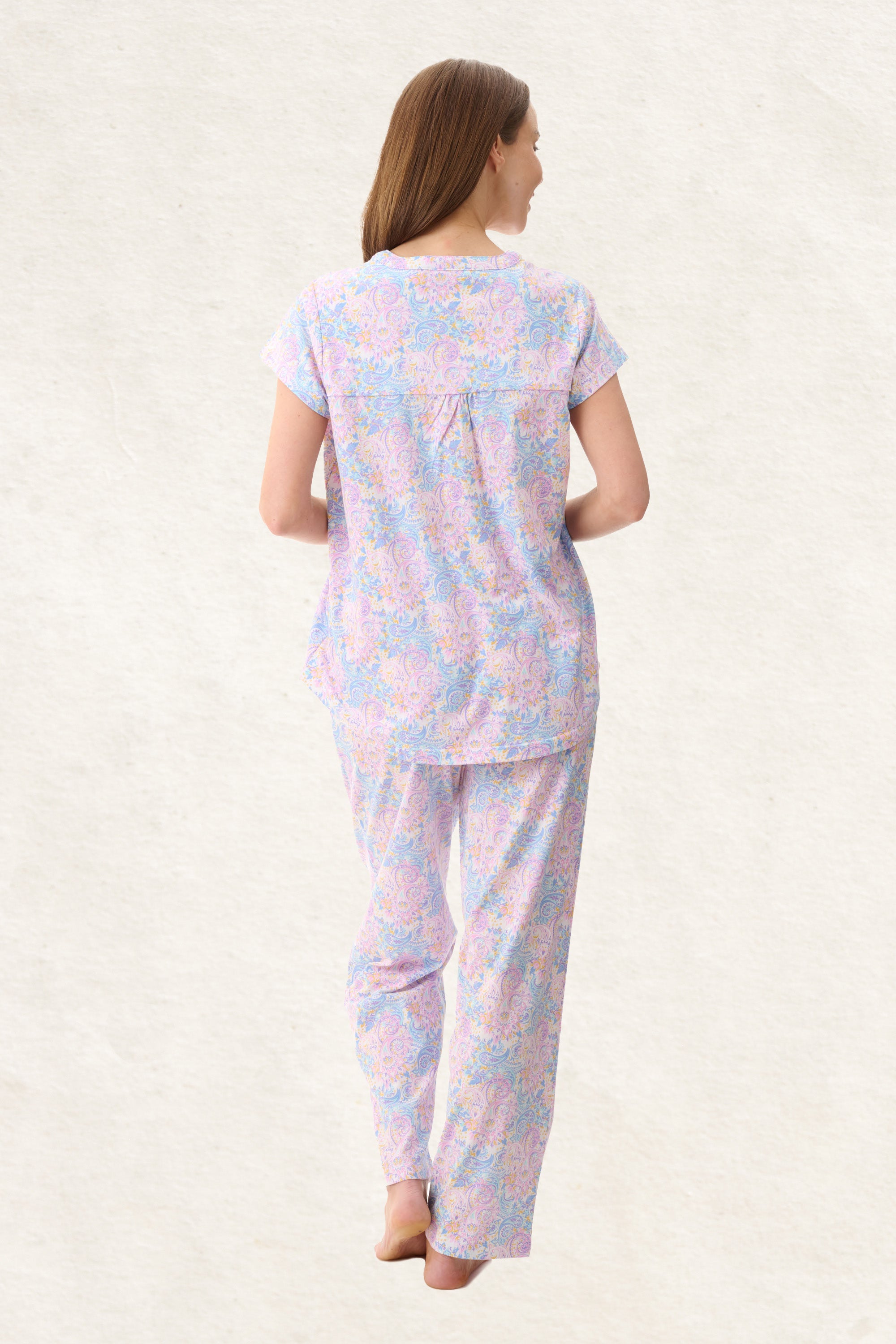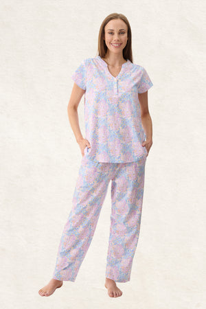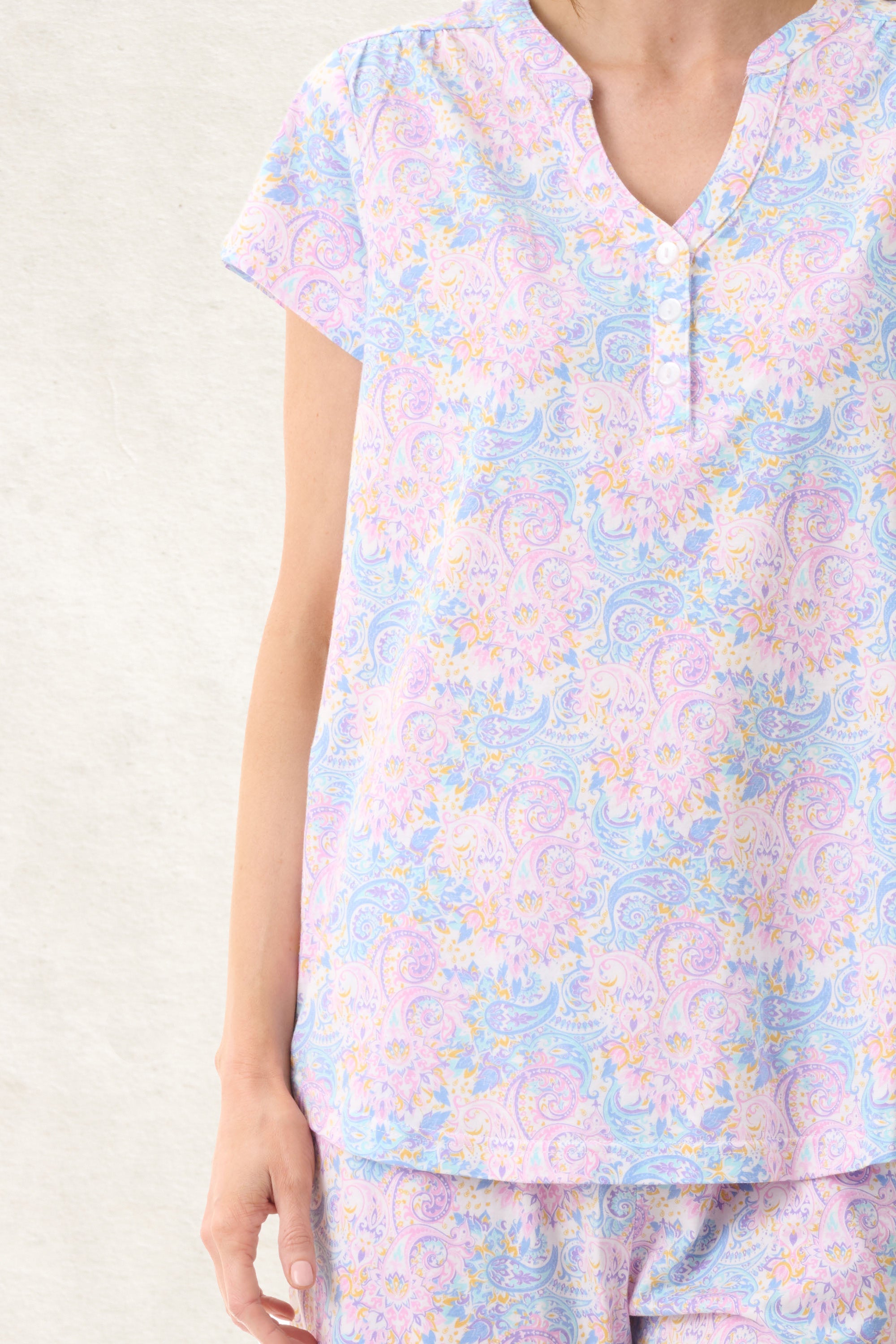 7-8th length pyjamas in a modern colourful abstract print knit jersey. Short sleeve top with a shaped neckband and 3 button opening. Pants are 7-8th length with a drawstring, side pockets and comfortable elastic waist.