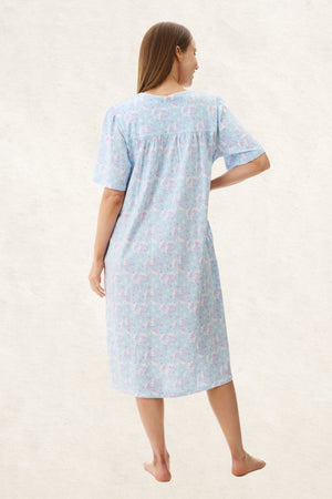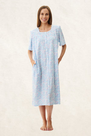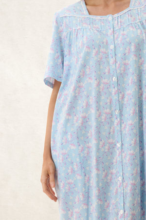 Fresh aqua floral print on beautiful 100% cotton knit jersey. Featuring a yoke with pintucked pleats and lace trim. Front and back yokes with gathers provides extra comfort. Full front button opening. Side inset pockets. Wear by itself or over one of the Val summer nighties for a gorgeous sleepwear outfit.