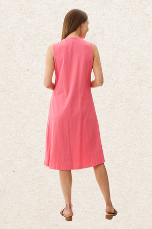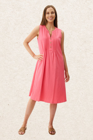 This gorgeous jersey dress, crafted from a comfortable blend of 95% cotton and 5% elastane, features sophisticated pintucking at the front for subtle texture and shape. With a soft V-neck, sleeveless design, and knee-length cut, it offers breathable comfort and effortless style that transitions seamlessly from day to night.