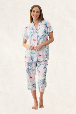 Sink into comfort with our irresistible Capri Pyjama Set. Crafted from a luxurious polyester elastane stretch satin, this summer-ready ensemble features a delightful tropical floral print. With a front button opening, collar and pocket on the top. The pant has a soft elasticated waist with self fabric tie.