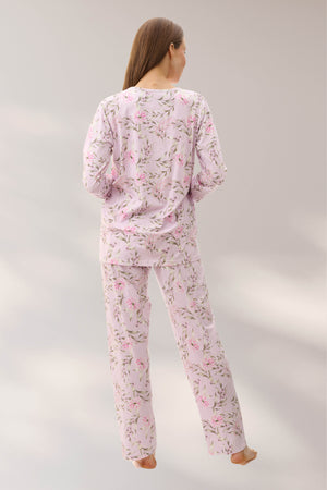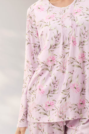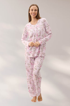 Long pyjama in the lovely pink Maxine print with hints of soft sage tones. Round neck long sleeve top with pintucks and white scallop elastic lace under the neck binding . Front pintucks either side of the sweet pink satin bow at centre front. The long pants have elasticated waistband with self fabric waist tie. Cotton Bamboo is soft, cool and comfortable to wear.