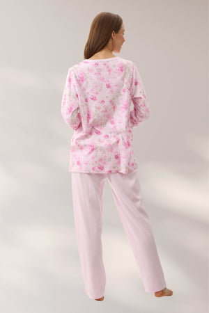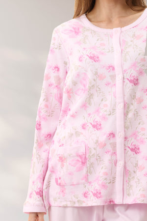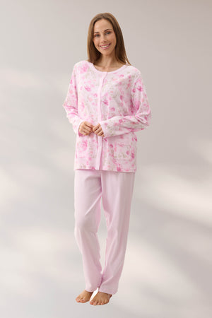 Long pyjama in a pink floral print on comfortable winter weight cotton interlock. A pretty and feminine look for the cooler nights. This pyjama has long sleeves, pockets, and front button opening. The top is print with plain pink bands. Long leg plain pink pants with soft elastic waist and self fabric waist tie.