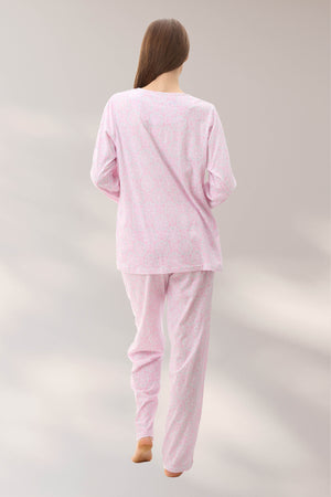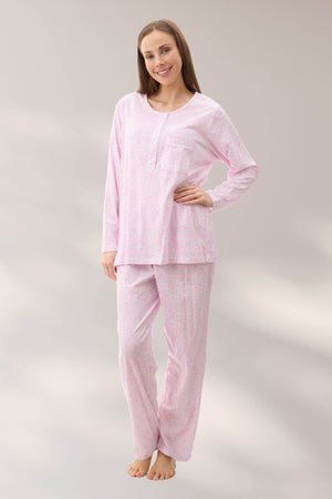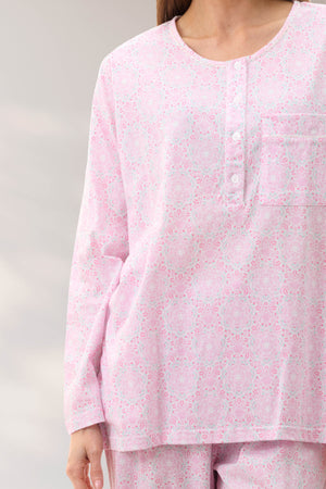 Long pyjama in gorgeous pink Mosaic print on soft and comfortable cotton jersey. Round neck with long sleeves, chest pocket, and front 4 button placket opening. White satin scallop trim. The long pant has an elastic waist, and a drawstring.