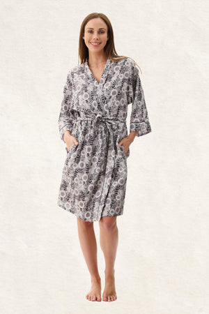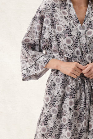Discover our Quill cotton fabric on a black base with soft pink and white floral blooms, offering a fresh, feminine contrast and subtle elegance. Crafted from 100% breathable cotton this short wrap features sleeves with bands around the opening, neck and cuffs with a striking black satin piping and tie belt. The soft breathable fabric is perfect for warm-weather lounging and dreamy summer nights.