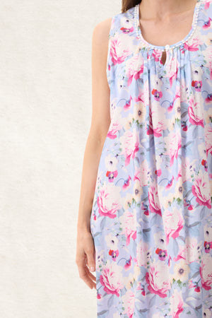 The beautiful Wendy floral print adds a touch of elegance to our mid length nightie with its fresh blue base and summery feel. Crafted from 100% woven cotton this nightie has a keyhole front detail with pintucks and the neck binding is trimmed with a sweet bobble cotton trim. The soft breathable cotton will lull you into a peaceful slumber.