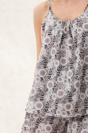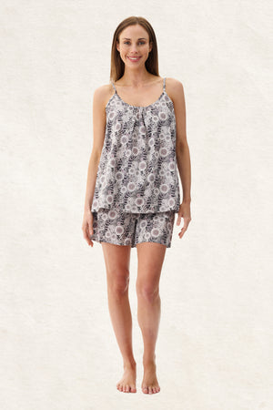 Discover our Quill cotton fabric on a black base with soft pink and white floral blooms, offering a fresh, feminine contrast and subtle elegance. Crafted from 100% breathable cotton this short pyjama features neckline gathers, adjustable straps, and elastic shirring at the back, for a better fit. The soft breathable fabric is perfect for warm-weather lounging and dreamy summer nights.