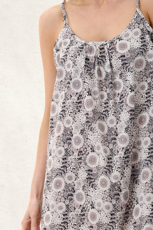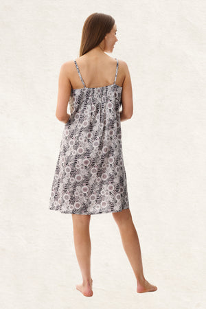 Discover our Quill cotton fabric on a black base with soft pink and white floral blooms, offering a fresh, feminine contrast and subtle elegance.  Crafted from 100% breathable cotton this short chemise features neckline gathers, adjustable straps, and elastic shirring at the back, for a better fit. The soft breathable fabric is perfect for warm-weather lounging and dreamy summer nights.