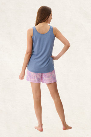 Introducing our Reese short pyjama set - the epitome of style and comfort for warm summer nights. This set features a Modal knit singlet and shorts adorned with elasticated waist, self tie and convenient side pockets on the shorts. This light and breezy fabric makes it an ideal choice for summer holidays, and the swirly abstract print adds a touch of modern elegance to your bedtime ensemble.