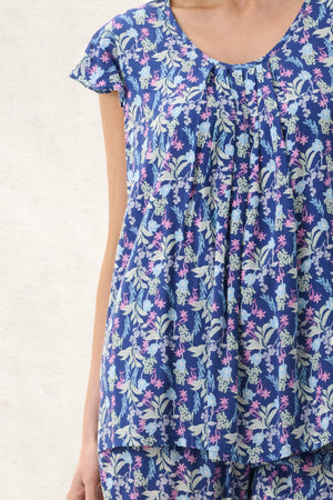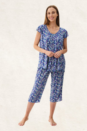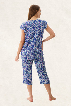 Introducing the 'Maria' Sleepwear Collection, where playful florals dance on a navy canvas. This flutter sleeve capri pyjama is crafted from 100% woven viscose. The top features a flutter sleeve and a self bind around the round neckline with soft pleats. The capri pants have a soft elasticated waist with self fabric waist tie and pockets. Light soft and cool, this floral print pyjama set is perfect to wear on warm summer nights.