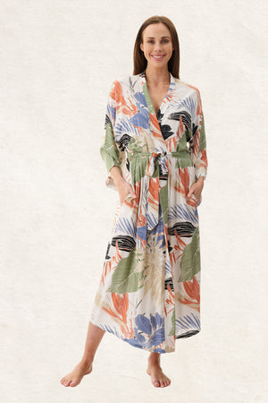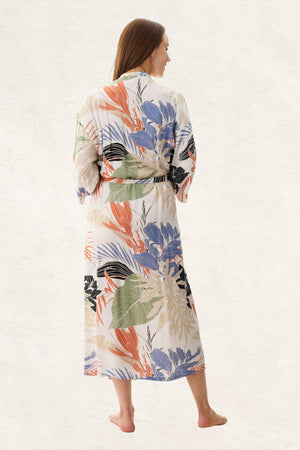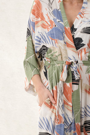 Indulge in ultimate comfort and style with our Nila mid-length wrap in soft woven twill. Adorned with a striking hand-illustrated tropical leaf print, the soft woven twill fabric ensures a relaxed and unrestricted fit, pairing perfectly with any piece from the Nila Sleep collection. The eye-catching tropical leaf print adds a touch of tropical charm, combining comfort and style seamlessly.