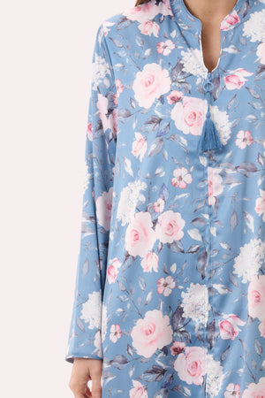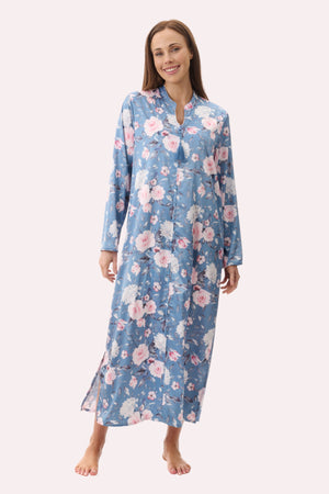 Long caftan with long sleeves in the dreamy "Jaclyn" floral print on stretch satin. Shaped neckline with flat navy piping trim. Front zip opening with tassel and side splits at hem.