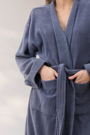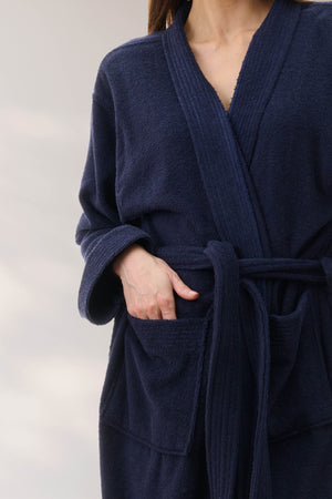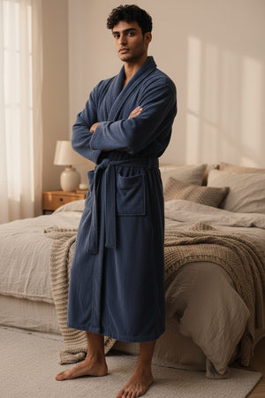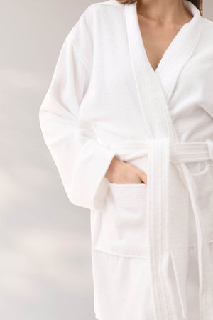 Double sided towelling Unisex wrap is the perfect gown for year round comfort. Our soft and fluffy wrap is easy care and soft to wear. A timeless gown with wrap over front and waist tie belt, front patch pockets, neckband and sleeve cuffs are trimmed with multi stitching.