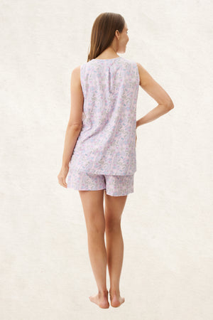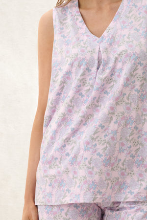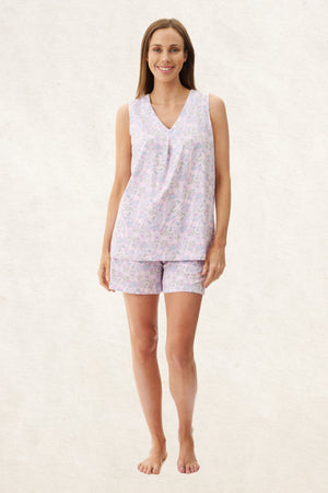 Embrace the charm of our Hope sleeveless short pyjama featuring a V Neck with inverted pleat at the front and binding around the armholes. This delightful floral set blends comfort and style effortlessly with pyjama shorts featuring side pockets, soft elasticated waist and self fabric tie. Crafted from a blend of 50% Cotton, 45% Bamboo, and 5% Elastane, it promises a soft, breathable, and stretchy embrace for your most comfortable nights' sleep.