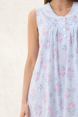 A gorgeous blue floral print on 100% cotton knit jersey. This sleeveless short nightie is a lovely choice for hot summer nights. This nightie has self binding on the armholes, a vee shaped neckline, with narrow lace detail. Crisscross pleating detail either side of the button placket.