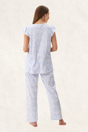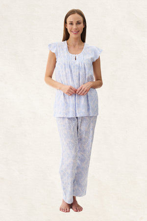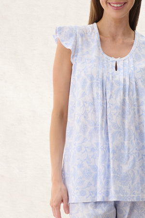 Wesley damask blue printed design on beautiful 100% cotton knit jersey. Flutter sleeve pyjama features a round neckline with self binding, and satin scallop trim and a centre keyhole with pintucks either side. The ankle length pant has a soft elasticated waist with self fabric tie.
