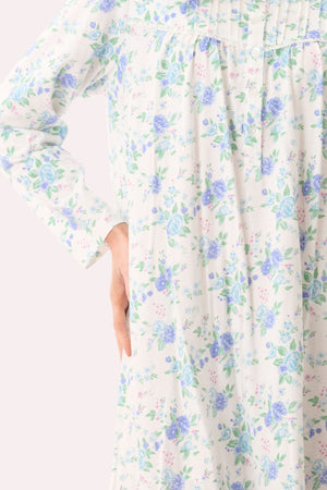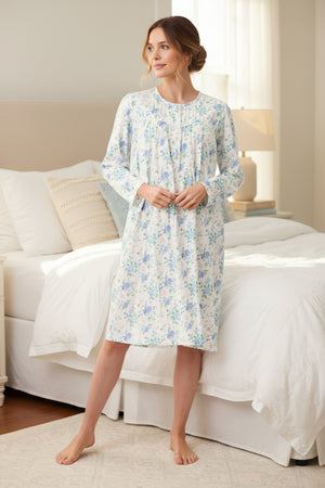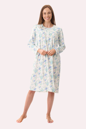 Short nightie in Ivory with "Xion" floral print in tones of blues, pinks and green on 100% cotton knit jersey. This nightie has long sleeves, a vee shaped yoke with lace, and pintucks either side of the button placket. Soft gathers fall from the yoke to the front skirt. The neckline has a narrow self frill.