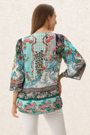 This 3/4 flowy sleeve blouse features a striking engineered border print that adds a refined touch to your look. The v-neckline with tassel brings subtle movement and boho charm, while the front yoke detail with soft gathers enhances the blouse’s fluid silhouette. Crafted from luxurious viscose silk-feel crepe, it offers a silky drape and breathable comfort—perfect for dressing up or down with effortless style.