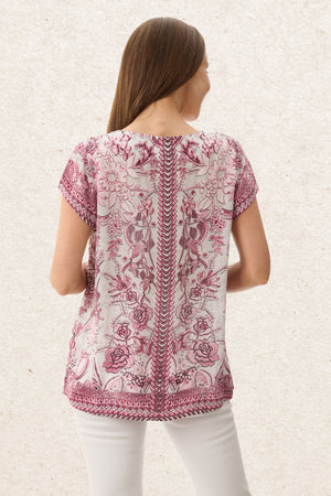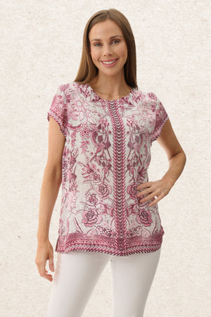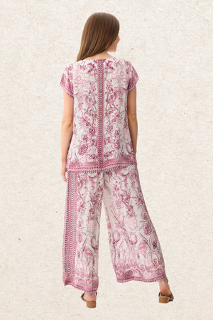 Featuring a striking all-over print, this cap sleeve top is designed with a classic crew neck and a flattering, easy fit. Made from viscose silk-feel crepe, it offers a smooth, lightweight feel with an elegant drape. Wear it on its own for a pop of print, or pair it with the matching pant for a coordinated, statement-making look.