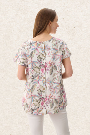 This print extended sleeve top is crafted from a breathable blend of 55% linen and 45% viscose, offering lightweight comfort and effortless style. Featuring a flattering V-neck, modern boxy shape, and tailored bust darts, it balances relaxed ease with subtle structure. Thoughtful design elements like panelled shoulders, extended sleeves, and a chic button-through back closure add refined finishing touches—perfect for casual sophistication.