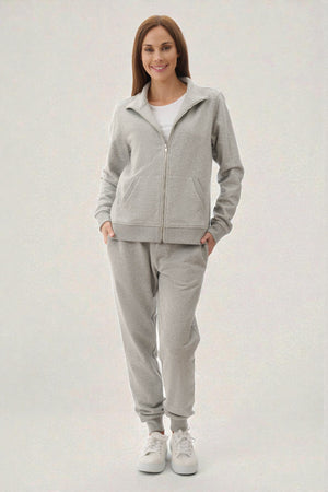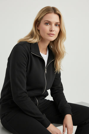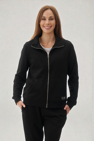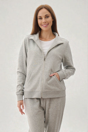 Crafted from a luxe loop-back fabrication, this zip-through lounge jacket delivers comfort with an elevated finish. Designed with ribbed hems and cuffs, it features a functional front zip and a kangaroo pocket, making it an effortless layering piece for relaxed, everyday wear.