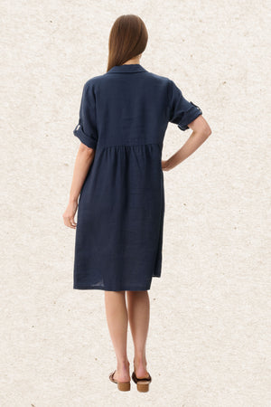 Elevate your wardrobe with our button-through collared linen shirt dress, crafted for timeless versatility and comfort. Designed with long sleeves featuring functional tabs, this piece easily transforms from full-length to rolled-up for a more relaxed look. The subtle gather detail at the waist creates a flattering silhouette, adding a touch of feminine shape without sacrificing ease. Made from 100% breathable linen, this shirt is your go-to for effortless everyday style—from workdays to weekends.