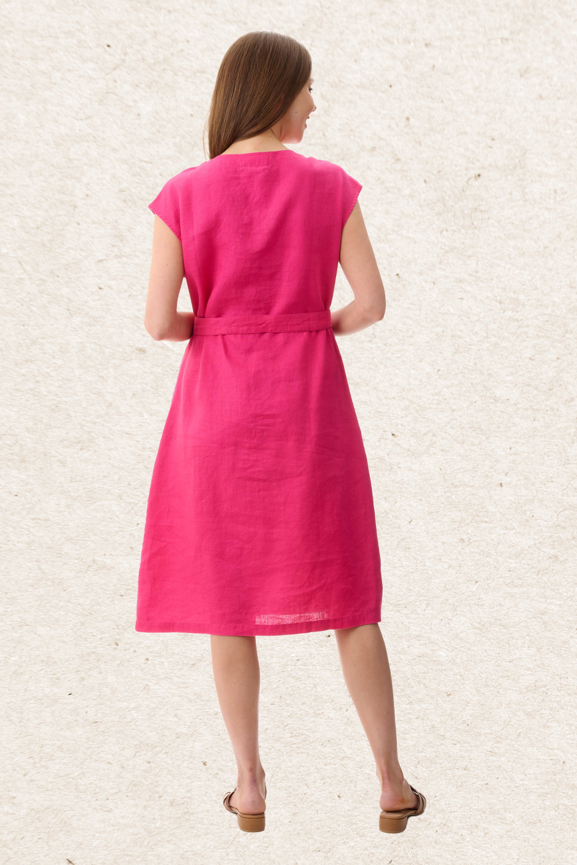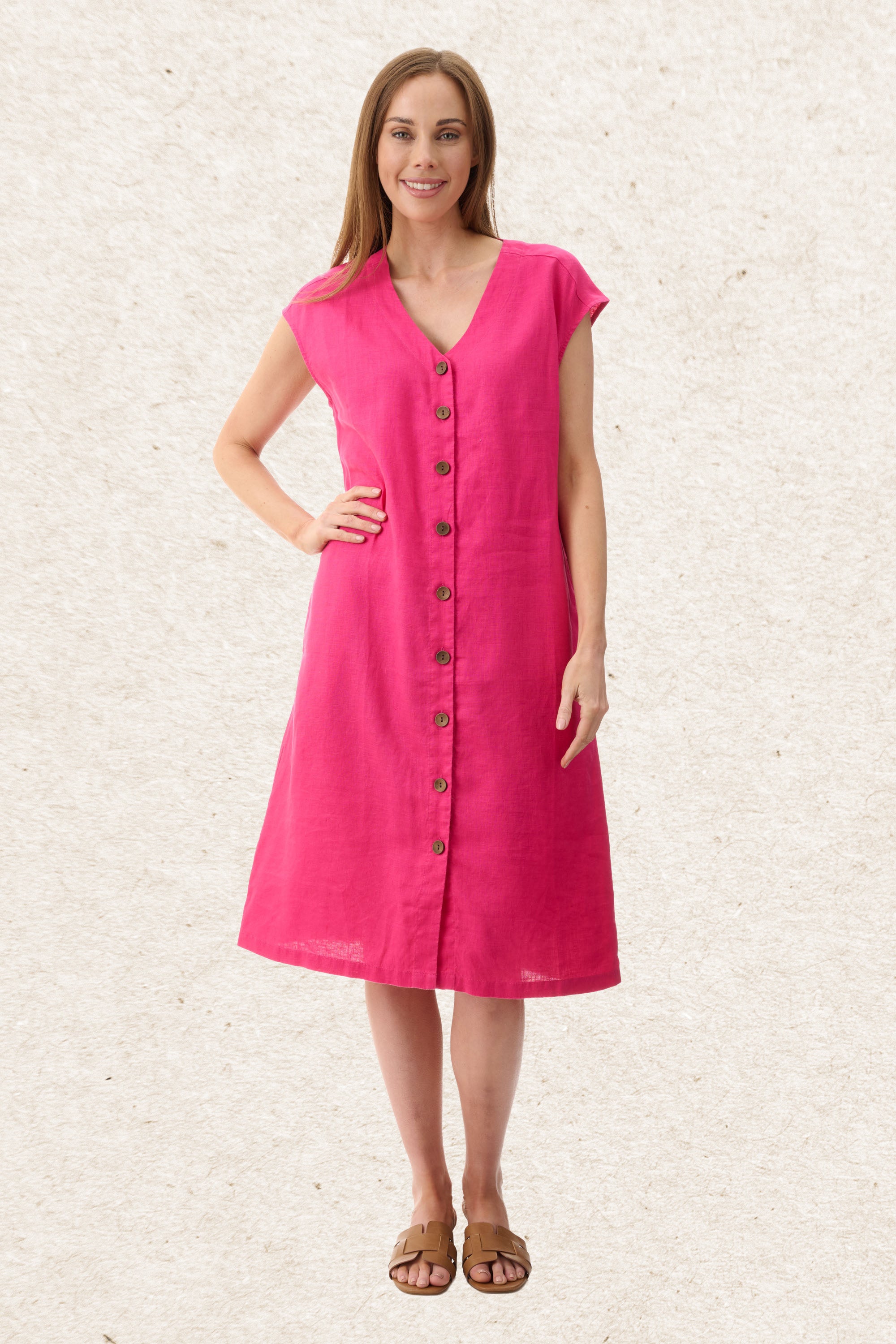 Made from 100% breathable linen, this dress offers effortless style with a naturally soft, textured finish. Featuring a flattering V-neckline and a fully button-through front, it’s detailed with feature buttons for a polished touch.