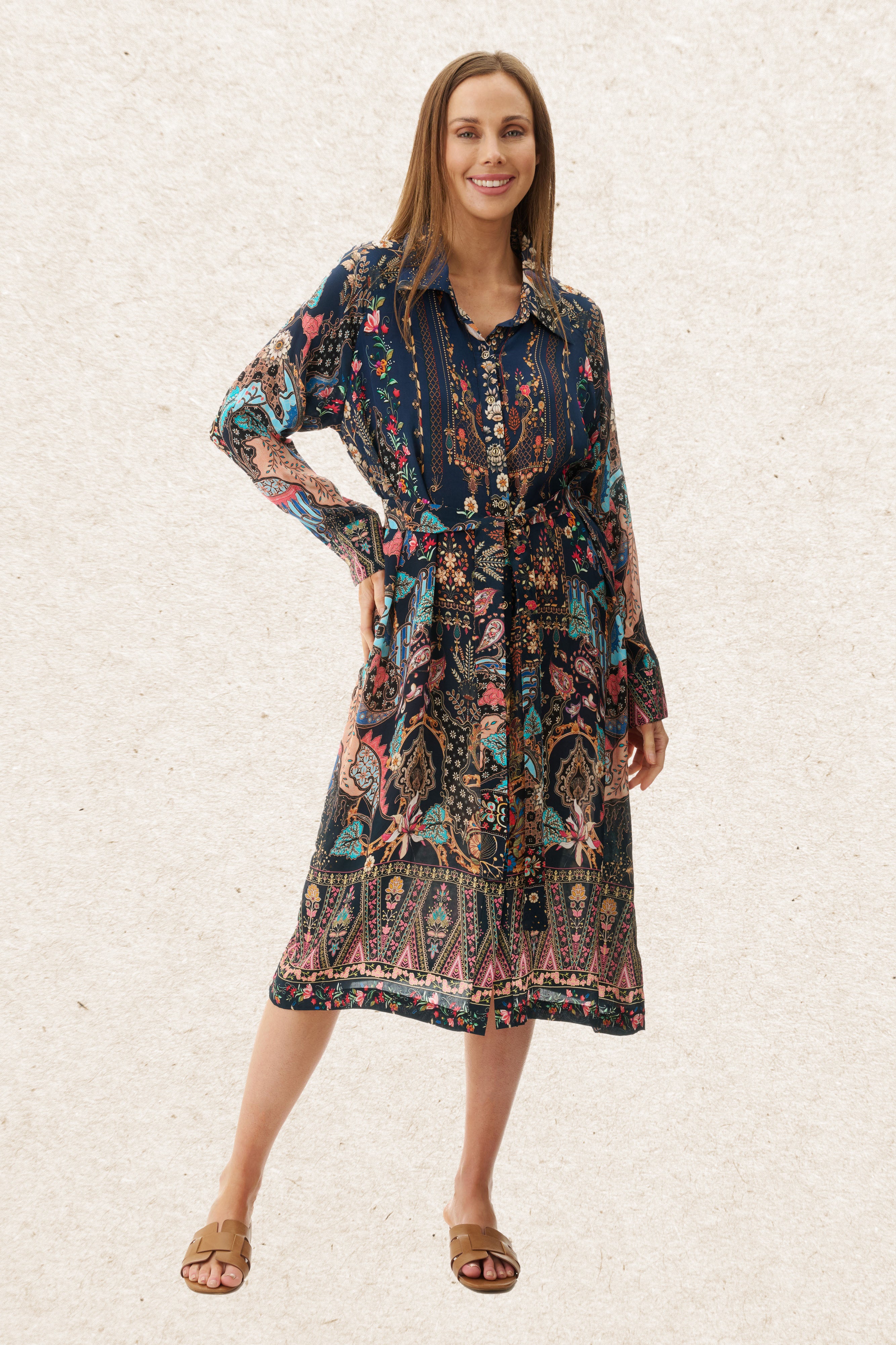 This shirt dress redefines everyday elegance with its raglan sleeves and fluid silhouette. Crafted from a viscose silk-feel crepe, it offers a soft, lustrous drape with a lightweight, luxurious feel. The classic collar and button-through front bring tailored structure, while the removable belt allows you to cinch the waist or wear it loose for a more relaxed look. Falling just over the knee, it’s a versatile piece that transitions seamlessly from day to night with minimal effort.