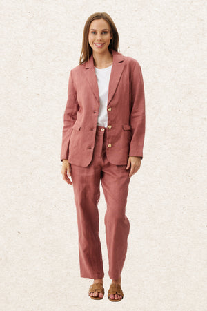 This linen tailored blazer is the perfect trans-seasonal piece, combining structure with breathable ease. Made from 100% linen, it features a classic collar, button fastening, and a lightweight, unlined construction for a relaxed yet refined fit. Whether layered over a dress or paired with tailored pants, it’s a versatile essential that elevates any look with minimal effort