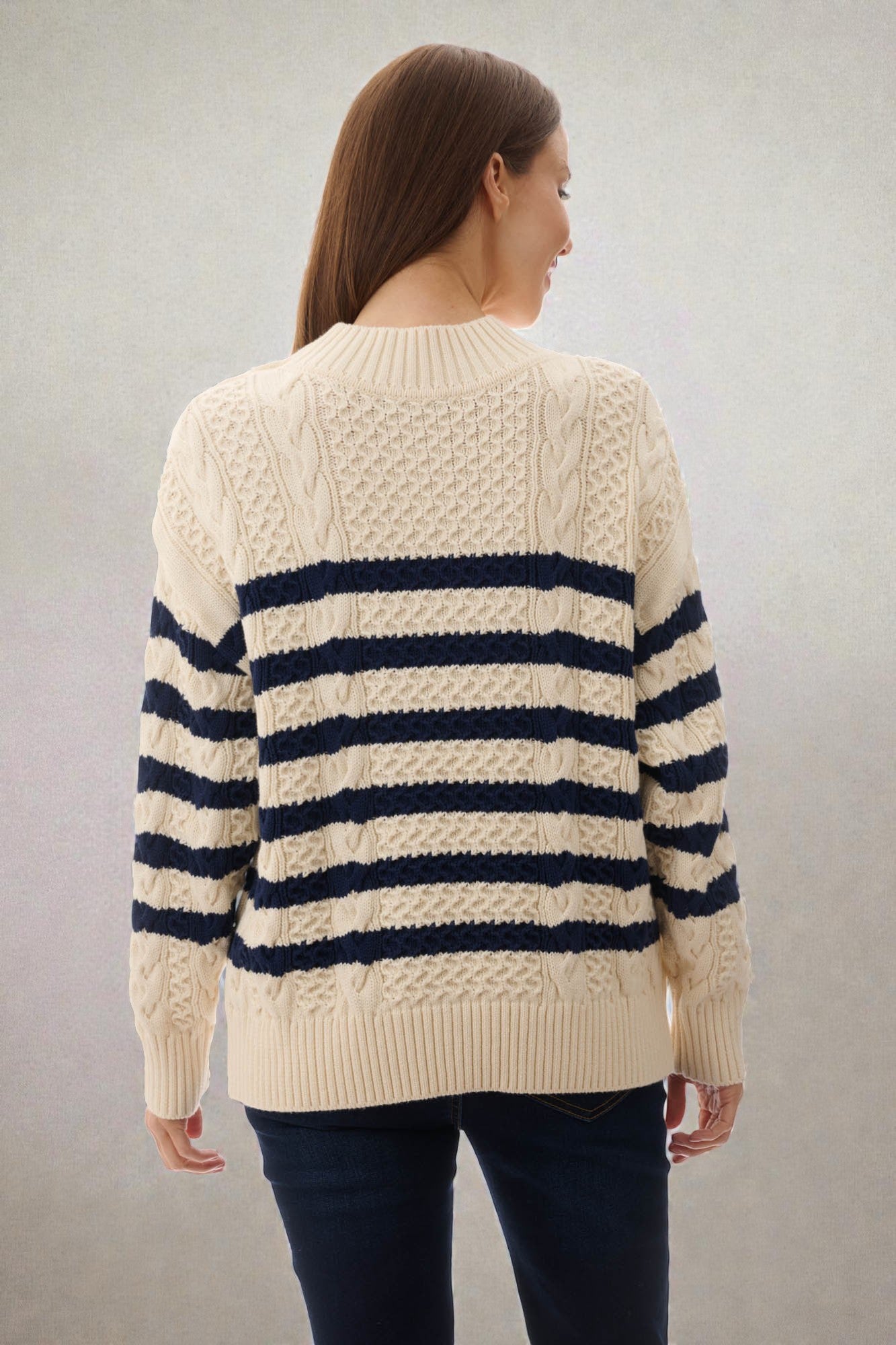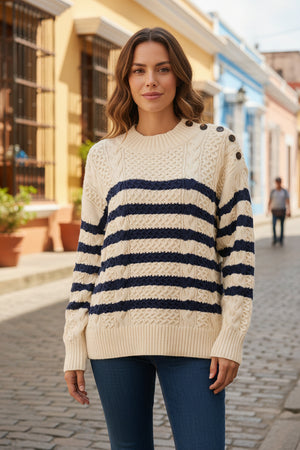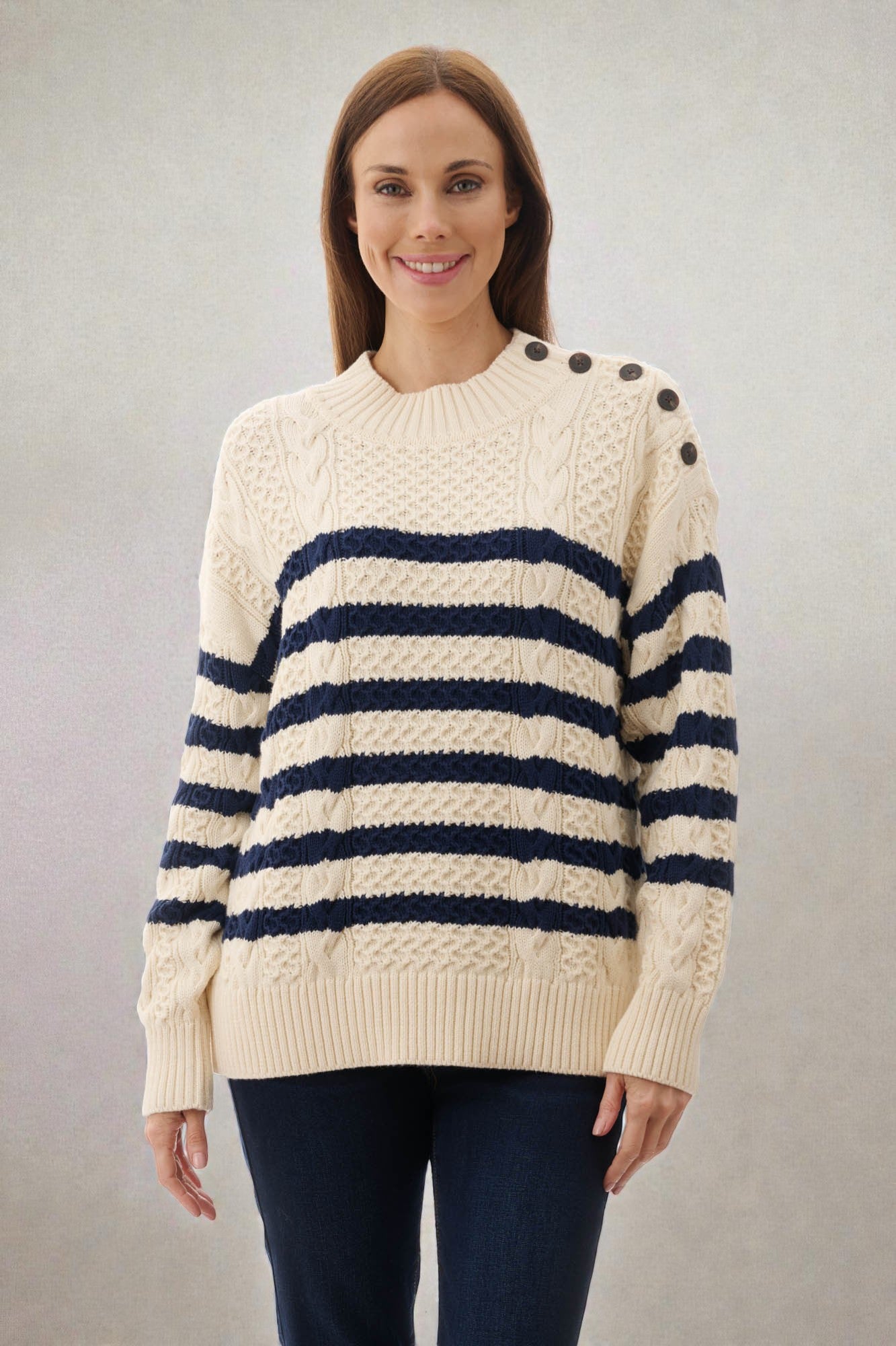 This jumper features a drop shoulder and long sleeves with ribbed neck, hem, and cuffs for a comfortable, classic fit. Detailed with buttons at the shoulder, all-over cabling, and an engineered stripe pattern, it’s crafted from a soft blend of cotton and cashmere for warmth and luxury.