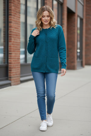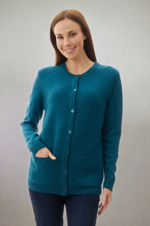 Crafted from pure wool, this long-sleeved button-front cardigan combines timeless elegance with contemporary design. The garment showcases intricate patterning across the front and pocket details, while the sleeves and back maintain a refined, understated aesthetic. A versatile piece for winter.