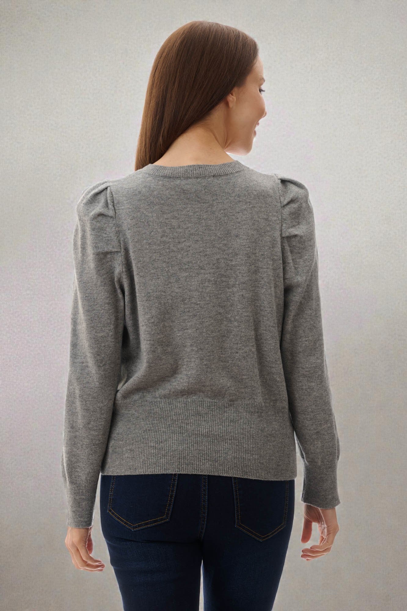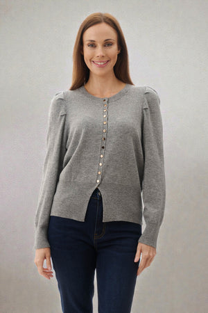 This cardigan features pleated, voluminous shoulders and decorative gold buttons for a sophisticated, statement-making silhouette. Finished with a deep ribbed hem, it’s crafted from 100% wool for warmth, comfort, and timeless style.