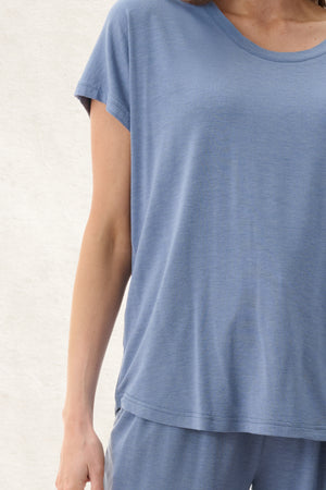 Discover the epitome of relaxation with this ankle-length pyjama set in Dusk Marle, crafted from marled slinky knit in luxurious Modal fabric. Known for its buttery soft touch and excellent breathability, Modal enhances the comfort of this set, making it a delight against the skin. The set features a relaxed t-shirt and wide leg pants, complete with convenient side pockets and a drawstring, providing the perfect blend of comfort and functionality for lounging and a peaceful night's sleep.