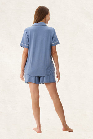 Discover the epitome of relaxation with this short pyjama set in Dusk Marle, crafted from marled slinky knit in luxurious Modal fabric. Known for its buttery soft touch and excellent breathability, Modal enhances the comfort of this set, making it a delight against the skin. The top features a button front with striking white satin piping feature along the front opening, collar, sleeve and pockets. Complete with convenient pockets on the shorts and a satin drawstring, providing the perfect blend of comfort and functionality for lounging and a peaceful night's sleep.