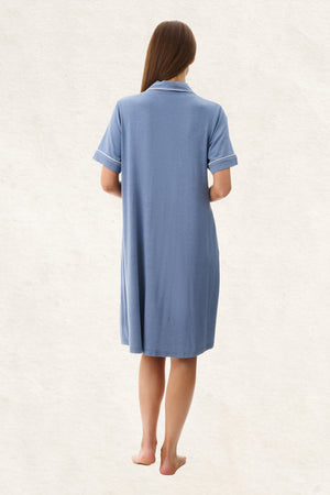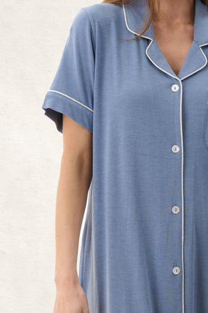 Discover the epitome of relaxation with this short sleeve short sleepshirt in Dusk Marle, crafted from marled slinky knit in luxurious Modal fabric. Known for its buttery soft touch and excellent breathability, Modal enhances the comfort of this set, making it a delight against the skin. The sleepshirt features a striking white satin piping feature along the front opening, collar, sleeve and chest pocket. Providing the perfect blend of comfort and functionality for lounging and a peaceful night's sleep.