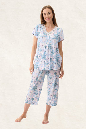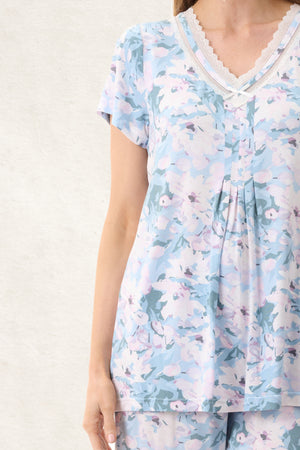 Introducing Amelia, a watercolour floral print on a lovely Mint colourway.  This capri pyjama set is adorned with a delicate lace neckline, while front pleats and a floaty fit add an extra layer of charm. Crafted from buttery-soft modal, luxurious comfort and dreamy nights await.