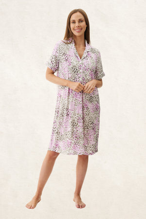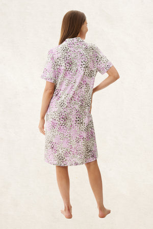 Dakota short sleeve sleepshirt adds a modern twist to your sleepwear with a mauve and soft steel grey abstract print on white. The sleepshirt features a button placket with a fresh contrast of white satin piping along the front, collar, cuffs and pockets. Complete with a chest pockets providing the perfect blend of comfort and functionality for lounging and a peaceful night's sleep.