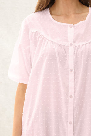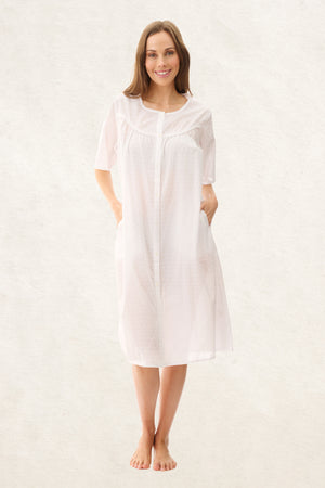 Brunchcoat with round neck and front and back yoke with soft gathers to the skirt. 100% woven spot dobby cotton is a summer weight fabric keeping you cool and elegantly comfortable . Front button opening. Cool and comfortable on warm summer nights and perfect to wear over the matching spot dobby sleeveless short nightie.