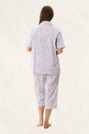 The Faye printed capri pyjama is a perfect blend of comfort and style, featuring a summery, multi-coloured print that brings a fresh and vibrant feel to your sleepwear collection. A classic short sleeve pyjama top with collar, front chest pocket, and full front button opening. The pyjama is trimmed with self piping. The capri length pants have a soft elastic waist with a self fabric drawstring.