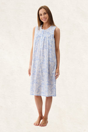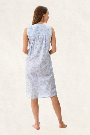 The Eliza print sleeveless short nightie features a fresh floral print in blue and white tones, perfect for warmer nights. It is styled with a round neckline trimmed in white lace, adding a soft, elegant touch. The sleeveless design includes binding around the armholes for comfort and clean finish. An angled straight front yoke with narrow pleats and a front button placket adds subtle detail, while gentle gathers from the yoke allow the skirt to fall with ease and flow. Add the matching Eliza brunchcoat to create a fresh, crisp summer set.