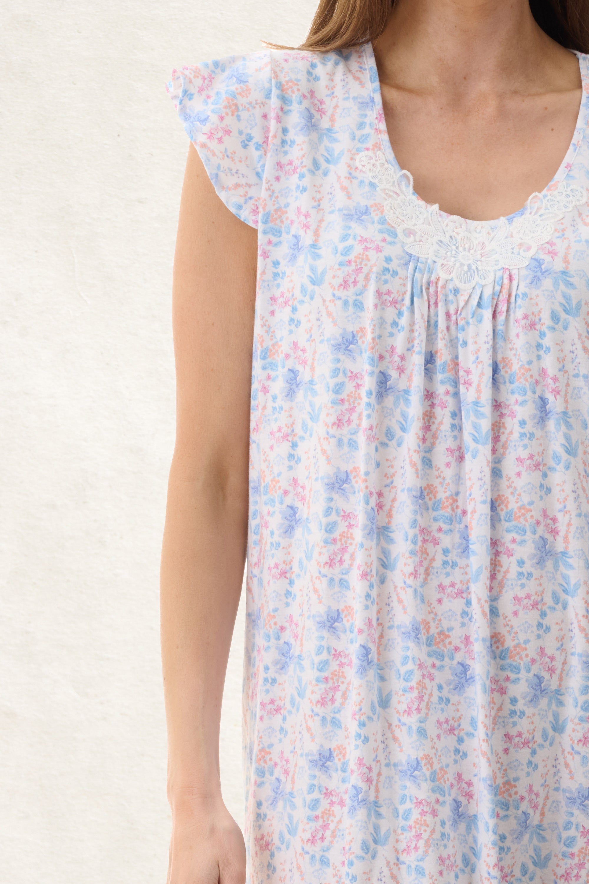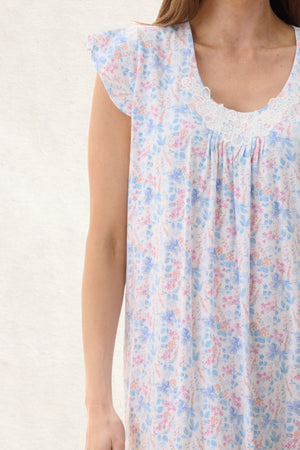 Light and fresh multi coloured floral print on 100% cotton knit jersey. Long nightie with soft flutter sleeve. Round neckline with self binding. Pretty cotton lace motif at the centre front with pintucks.