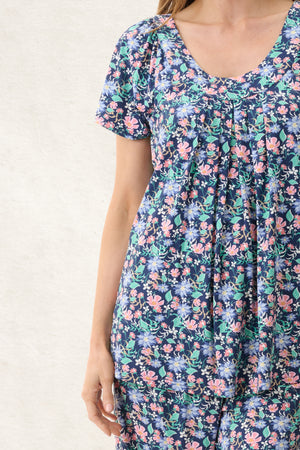 Cap sleeve capri pyjamas in slinky knit in a gorgeous royal floral. This pyjama features a shaped neckband , with centre pleats, and a cap sleeve with gathers from the neckline. The silky finish to the stretch fabric allows for ease of movement, and is cool to touch, a great choice for hot summer nights. The pants have an elastic waist and drawstring.