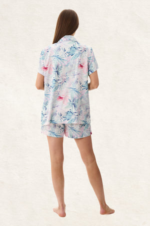 Sink into comfort with our irresistible Short Pyjama Set. Crafted from a luxurious polyester elastane stretch satin, this summer-ready ensemble features a delightful tropical floral print. With a front button opening, collar and pocket on the top.  The short has a soft elasticated waist with self fabric tie.