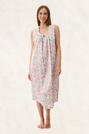 The beautiful Viviene floral print adds a touch of elegance to our pretty mid length nightie. Crafted from 100% woven cotton this nightie has a keyhole front detail with pintucks and the neck binding is trimmed with a sweet bobble cotton trim. The soft breathable cotton will lull you into a peaceful slumber.