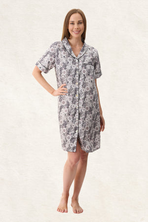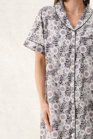 Discover our Quill cotton fabric on a black base with soft pink and white floral blooms, offering a fresh, feminine contrast and subtle elegance. Crafted from 100% breathable cotton this short sleepshirt features short sleeves, patch pocket, button down front with a rounded shawl collar. Featuring a striking black satin piping feature around the front opening, collar, cuffs and pockets.