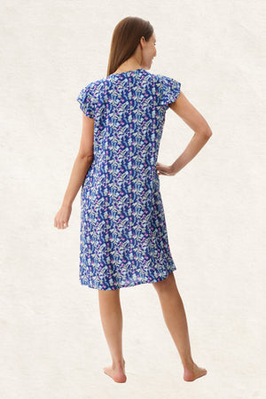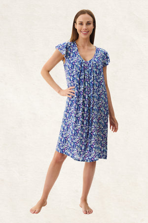 Introducing the 'Maria' Sleepwear Collection, where playful florals dance on a navy canvas. This flutter sleeve short nightie is crafted from 100% woven viscose. The nightie features a flutter sleeve finished with a self bind around the round neckline with soft pleats. Light soft and cool, this floral print nightie is perfect to wear on warm summer nights.